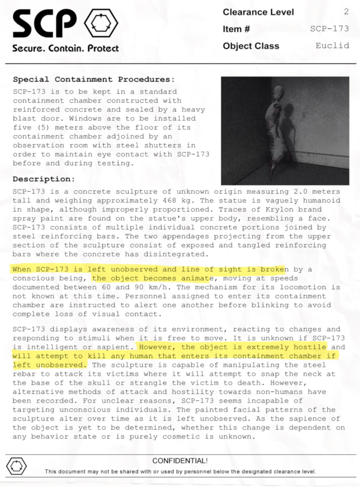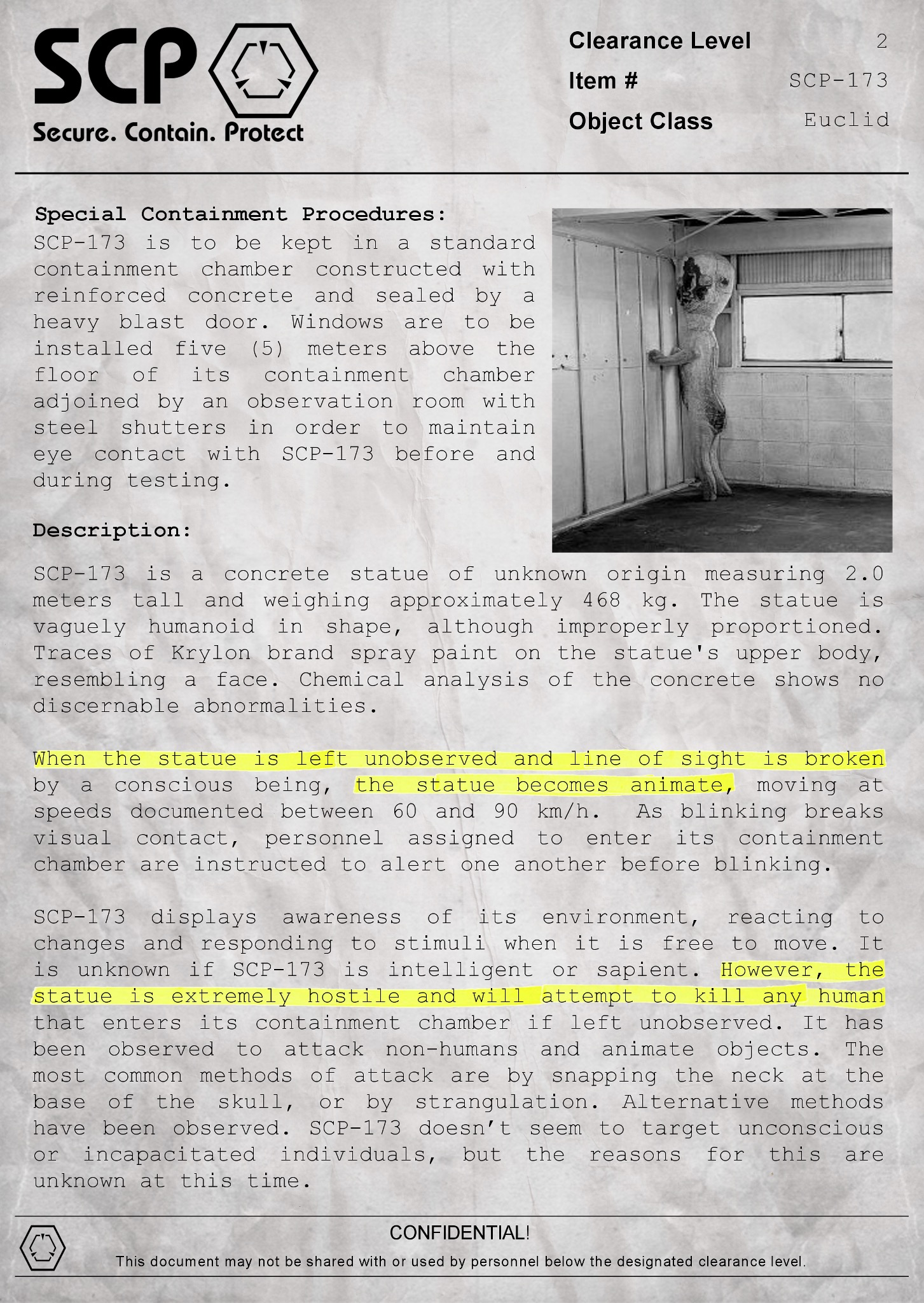 When SCP-173 is left unobserved and line of sight is broken by a human conscious being, the object becomes animate, moving at speeds documented between 60 and 90 km/h. The mechanism for its locomotion is not known at this time. Personnel assigned to enter its containment chamber are instructed to alert one another before blinking to avoid complete loss of visual contact.